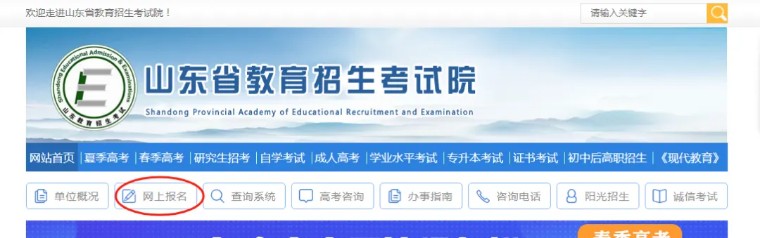 1、登錄山東省教育招生考試院官網(wǎng),點(diǎn)擊【網(wǎng)上報名】。