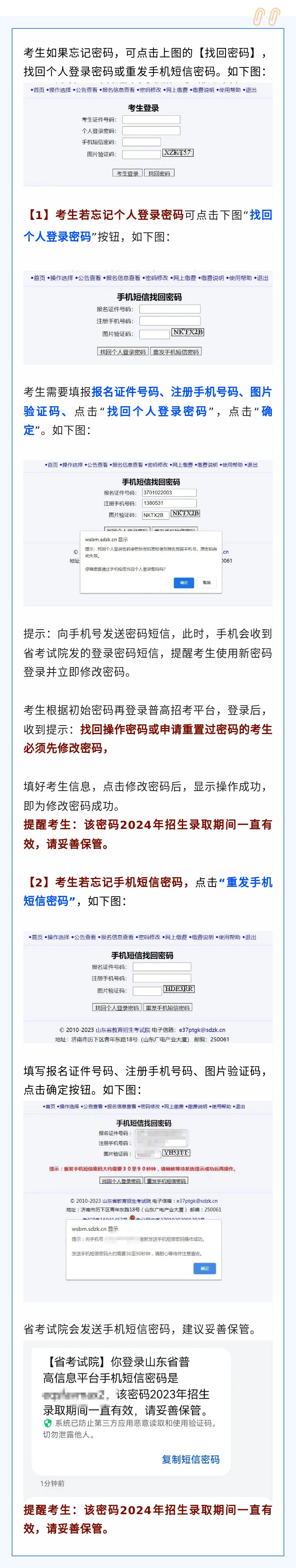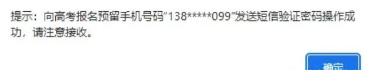 若遺失個人短信驗(yàn)證密碼,可在登錄頁面輸入考生號、報名證件號碼、圖片驗(yàn)證碼、“點(diǎn)擊發(fā)送”,系統(tǒng)提示:向高考報名預(yù)留手機(jī)號碼“1**********”發(fā)送短信驗(yàn)證密碼操作成功,請注意查收。如下圖::