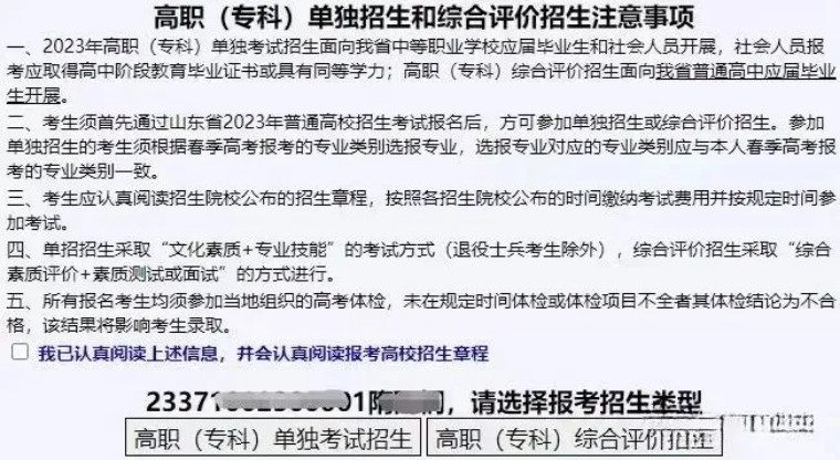 考生身份驗(yàn)證成功后,進(jìn)入“注意事項(xiàng)提示和報考招生類型選擇”頁面,如下圖: