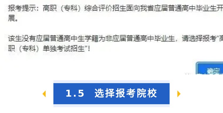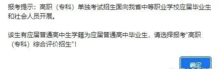 若考生為非應(yīng)屆普通高中畢業(yè)生,點(diǎn)擊“高職(??? 綜合評價招生”,系統(tǒng)將提示不允許報考:高職(??? 綜合評價招生面向我省應(yīng)屆普通高中畢業(yè)生開展。該生沒有應(yīng)屆普通高中生學(xué)籍為非應(yīng)屆普通高中畢業(yè)生,請選擇報考“高 職(??? 單獨(dú)考試招生”!如下圖: