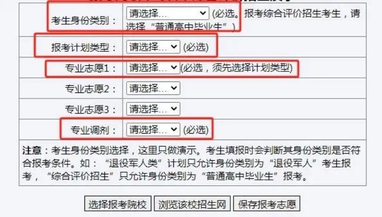 該頁面上半部分列出了報考院校本次招生專業(yè)設(shè)置情況,下半部分是考生身份類別、計劃類型、報考專業(yè)志愿選擇等。