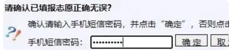 點(diǎn)擊“保存報考志愿”按鈕,系統(tǒng)提示:請確認(rèn)已填報志愿正確無誤?確認(rèn)請輸入手機(jī)短信密碼,并點(diǎn)擊“確定”,否則點(diǎn)擊“取消”。如下圖:
