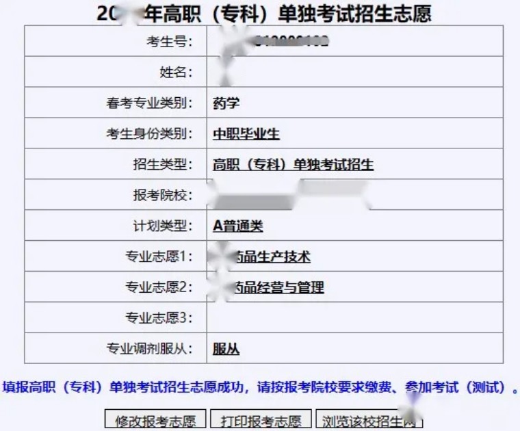 如上圖所示:填報高職(??? 單獨(dú)考試招生(或綜合評價招生) 志愿成功, 請按報考院校要求進(jìn)行繳費(fèi)、參加考試(測試) 。