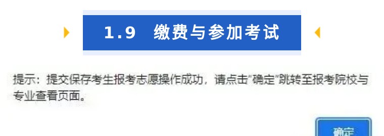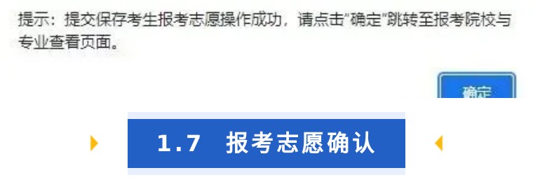 在報考專業(yè)選擇頁面,系統(tǒng)提示保存志愿成功后點(diǎn)擊“確定”進(jìn)入報考志愿 查看及確認(rèn)頁面,如下圖: