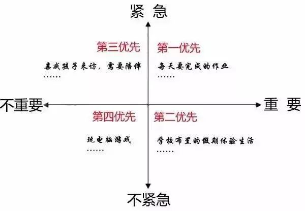 把一天要做的事情分為:重要緊急、重要不緊急、緊急不重要、不緊急不重要,明確了事情的先后順序便能做到心中有數(shù)了。